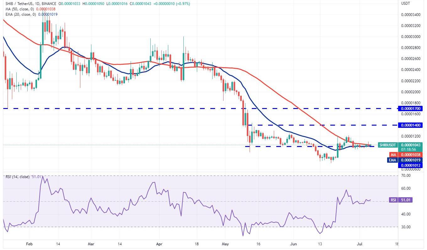 ShibaInu(?SHIB?)于7月5日突破50日均線(0.000010美元),但燭臺上的長燈芯表明空頭正在以較高水平賣出。一個小的積極因素是多頭不允許價格回落至0.000010美元以下。