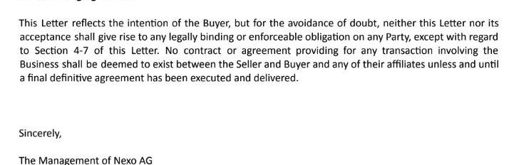 但其實,Nexo的“要約”是一份意向書,任何地方的律師都知道意向書不具有法律約束力。事實上,它的價值相當于和平時期的衛生紙,我們任何一個人都可以寫一份意向書來收購Nexo的所有剩余資產,但這并不意味著什么。?