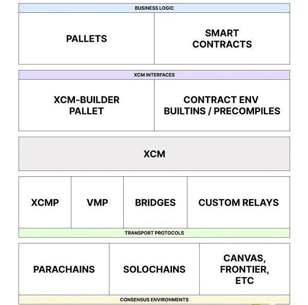 今年五月初,Polkadot在其v0.9.19中正式啟用了XCM,其中跨共識的涵義在于,這種通信格式不僅能在Polkadtot鏈間的UMP、DMP和XCMP中采用,還能夠在智能合約、Pallet、橋以至SPREE之間進行通信。