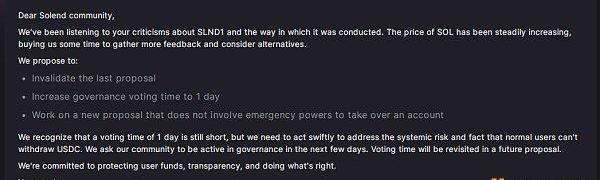 Solend表示,1天的投票時間仍然很短,但需要迅速采取行動,以解決系統性風險和普通用戶無法提取USDC的事實。要求社區在接下來的幾天內積極參與治理。投票時間將在未來的提案中重新討論。