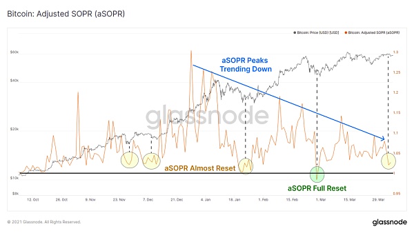 aSOPR本周幾乎重設為1.0,表明獲利盤減少,并表明市場的信心依然存在。