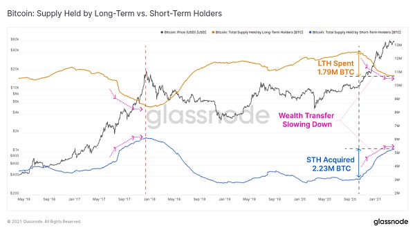如粉紅色所示,相對的財富轉移正在放緩。這是因為長期持有者放緩賣出。