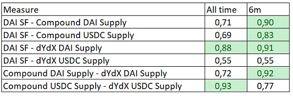 可以看到,穩定費和 Compound 供給利率之間的相關性隨時間變得越來越強。Compound 啟動時的相關系數是 0.71 ,過去 6 個月則是 0.90 (你可以在本節后半部分找到關于相關性的所有概述)。這是為什么呢?