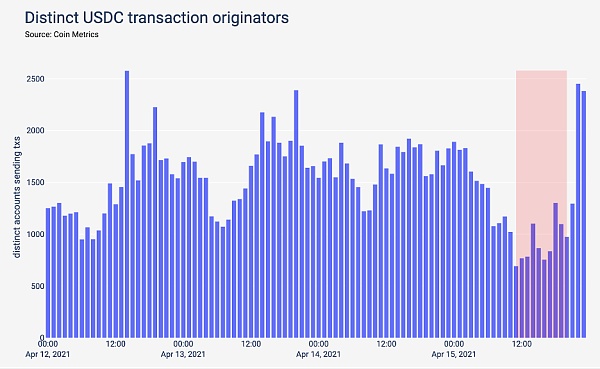 一些ERC-20代幣也因中斷受到了影響。 其中,USDC是受影響最大的代幣之一,在中斷期間,交易發起人的數量明顯減少: