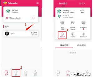 2) 1.充值想要質押的波卡數量,2.點擊“質押”,3.選擇“綁定資產”