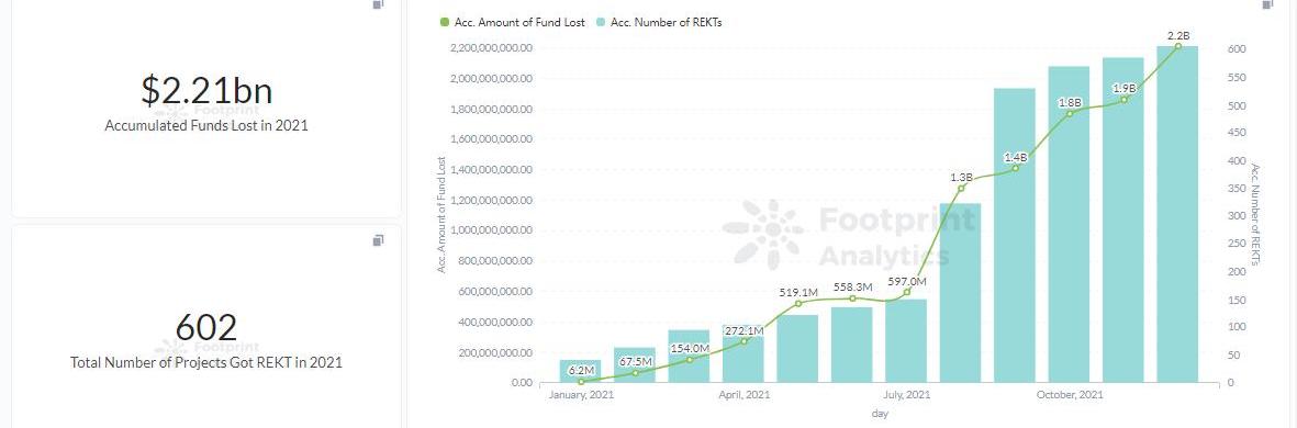 根據FootprintAnalytics的數據,2021年有600多個項目被REKT,其中三分之一遭遇資金損失,累計金額達22億美元。