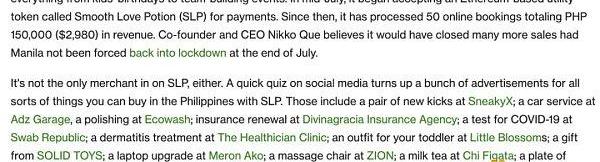 可以說,更具開創性的事情發生在1.5年后的2021年8月,當時菲律賓的商家開始接受SLP支付。至此,Axie已經積累了數百萬玩家,并且過渡到Ronin側鏈,并為用戶產生了數億美元的收入。