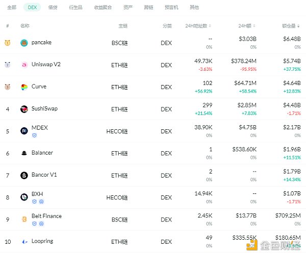 交易量排名前十的DEX 排名來源:DeFibox