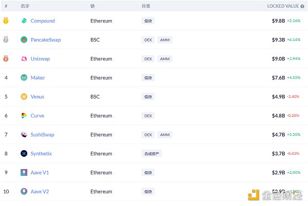 鎖倉量排名前十的借貸平臺 排名來源:DeFibox