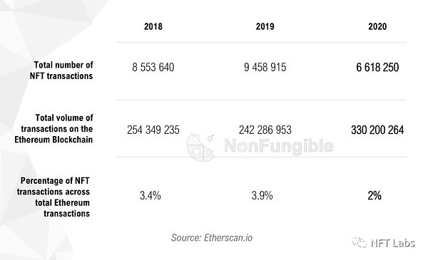 由此可見,2019 年,NFT 在加密寒冬期間取得了堅實增長:NFT 在整個以太坊市值中占比 1%?以上,對比特幣市值也有一定收益。