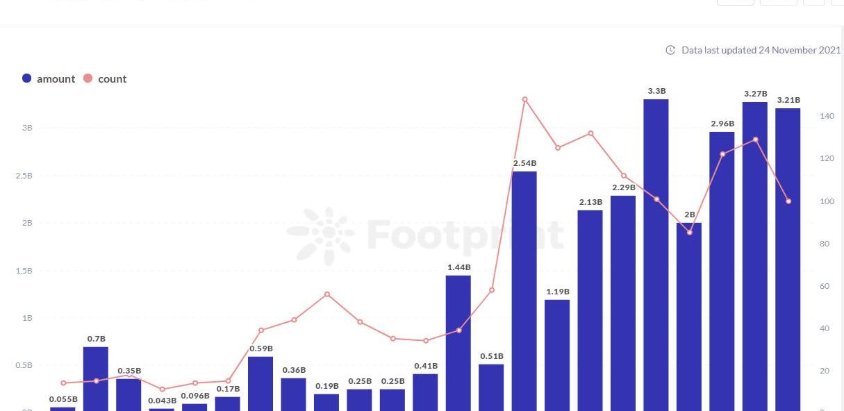 數據來源:FootprintAnalytics-2021每月融資金額趨勢圖
