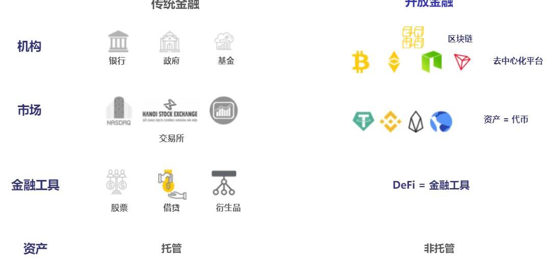 簡單來說DEFI就是將傳統金融搬到區塊鏈網絡里。但相比傳統金融,它通過區塊鏈實現了去中心化,利用智能合約取代傳統金融領域中的特權機構,使用戶以更低的成本享受到金融服務,并且提升整個金融體系的運行效率。如下圖,開放金融的各種服務都能在傳統金融上,基本都能找到對應的模塊和服務。