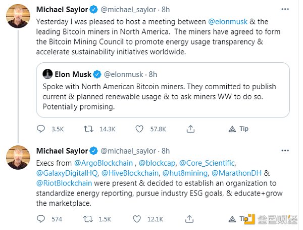 MicroStrategy首席執行官 Michael Saylor轉推表示,其主持了馬斯克與領先的北美比特幣礦企之間的會議,這些礦企已同意組建比特幣挖礦委員會(Bitcoin Mining Council),以提高能耗透明度和加快全球范圍內的可持續性活動。