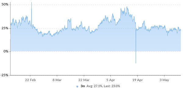 如上圖所示,目前23%的年化溢價低于平均水平,遠低于與4月13日47%的峰值。在那個時候,ETH在三周內累計上漲了52%,接近2400美元。