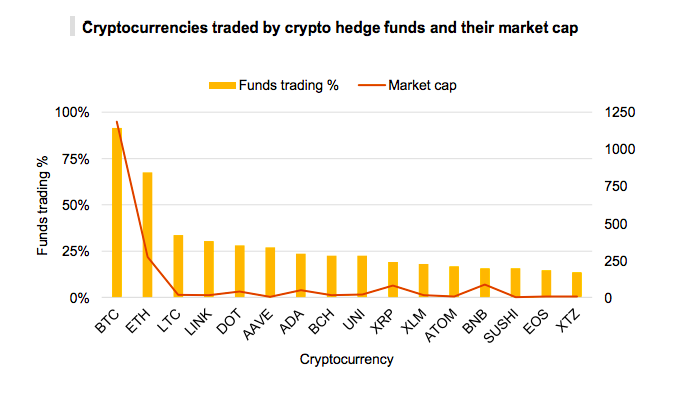 大多數加密對沖基金交易比特幣(92%),其次是以太坊(67%),萊特幣(34%), LINK(30%),DOT(28%) 和AAVE(27%)。