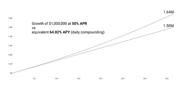 每日復利時,40%的APR就變成了49%的APY,400%的APR就變成了5242%的APY。這就是復利的力量,在像DeFi這樣的高利率環境中尤其普遍。當然,以太坊DeFi的小倉位是無法從這種復利中受益的,因為每天認領獎勵和重質押的gas費用將超過回報。下表顯示假設我們投資100萬美元,以50%的APR獲取收益,以及認領每天的獎勵來進行復利的可能回報。