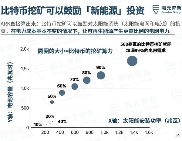 利用真實數據,ARK Invest得出,比特幣挖礦可以鼓勵對太陽能發電系統(太陽能電網和電池)的投資。在電力成本基本不變的情況下,讓可再生能源產生更高比例的電網電力。