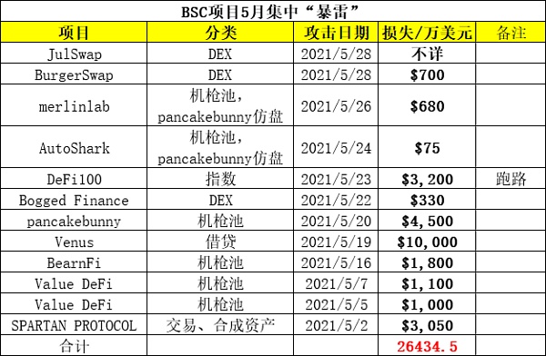 即將過去的5月,對于BSC來說,是最灰暗的一個月。本月有11個項目集中暴雷,包括BSC最大的借貸平臺Venus、BSC最大的機槍池pancakebunny、BSC最早的DEX平臺BurgerSwap。這些項目在被攻擊前,有些正如日中天,有些早已落寞。被攻擊后,有些平臺應對得力,社區重拾信心。