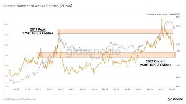 活躍實體的數量也出現了類似的回落,指標從37.5萬的高位值回落到25萬左右。這再次與2017年末至2018年初觀察到的值相符,因為隨著BTC價格的下跌,參與者對該資產的興趣減弱。