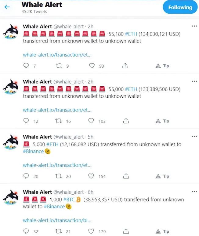 第一個因素與定義有關。一筆加密貨幣交易要有多大才能被歸類為鯨魚運動?答案取決于所使用的追蹤工具。例如,鯨魚警報似乎會在其Twitter中報告13個區塊鏈上的每一筆超過100萬美元的交易。