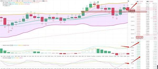 日線級別K線五連陽且上一根K線更是下影很長表明下方的支撐十分強力,行情回踩就是給到多單進場的機會,日內開線后行情嘗試上行但上行無力再度回落有觸及MA5均線的情況,技術面看,布林帶通道整體縮口,MA各均線上行多頭趨勢十分明顯,附圖MACD多頭能量主導市場但目前來看放量無力表明多頭能量不足且快線上行穿過慢線后馬上拐頭向下有下行穿過慢線的跡象,KDJ三線更是已經拐頭向下,那么結合技術指標來看,目前的行情整體來看依然還是一個上行的趨勢,但短周期內存在一定的回踩空間,日線級別操作可以等待行情回調至1260-1245一段給到我們一個中長線的多單布局思路,上方目標關注新高1440附近位置破位情況決定是否離場。近期行情建議小倉位進場