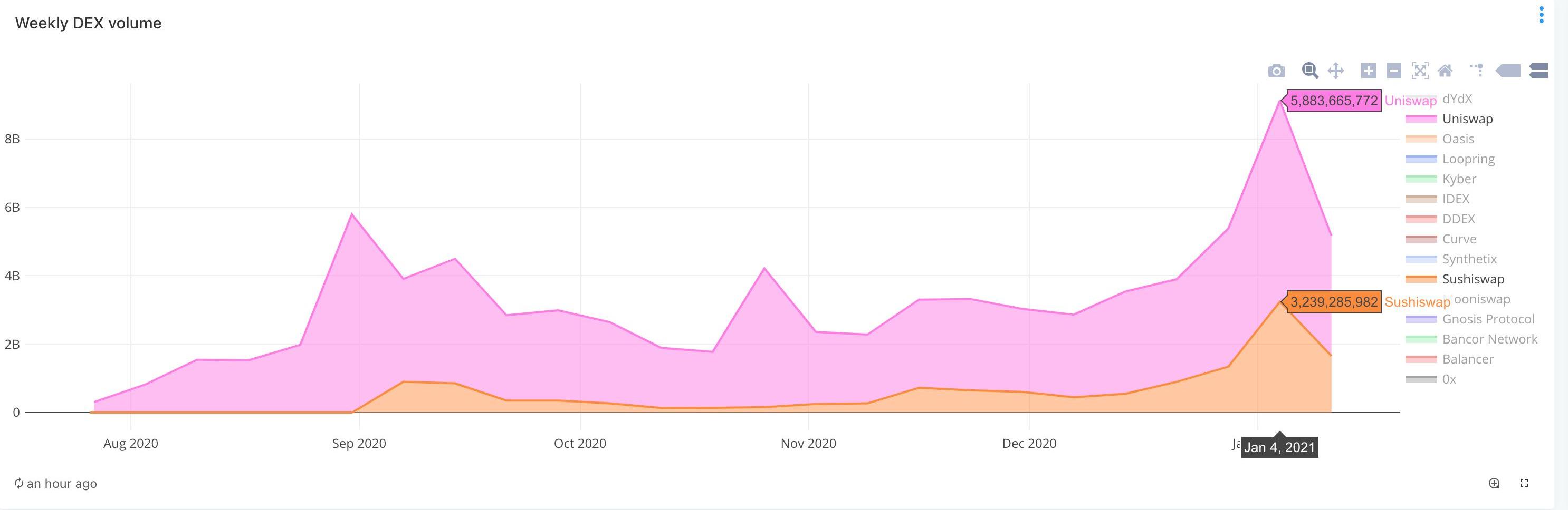 今年年初,去中心化交易所交易量達到了過去幾個月的最高水平。1月4日當周,Uniswap仍以58億美元的交易量位居市場首位,排名第二的是……32億美元的Sushiswap。