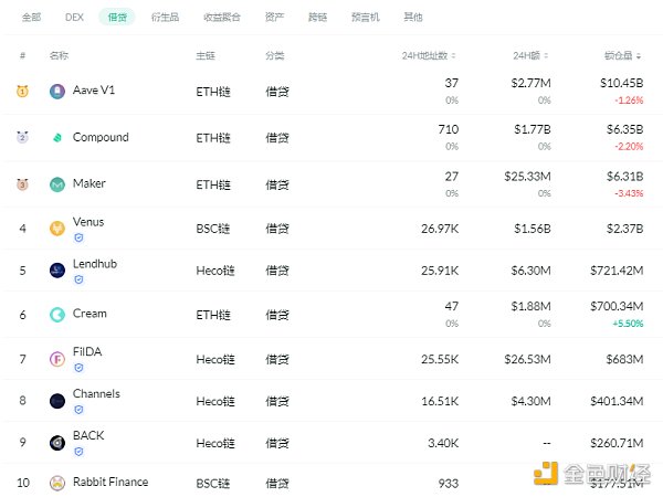 鎖倉量排名前十的借貸平臺 排名來源:DeFibox