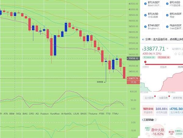 小時級別來看,大餅觸底33555一線反彈走震蕩,目前持續在35000上方震蕩整理,技術面來看,布林軌道整體向下運行,處于一個下行通道,幣價承壓于各均線下方,MACD呈空頭排列持續放量,快慢線零軸下方下移,KDJ三線向下擴張,整體來看,空頭趨勢明顯,建議反彈進空即可。