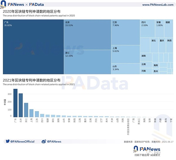 根據國家知識產權局的統計,從總體情況上看,2020年國家統計局統計的關鍵詞為“區塊鏈”的專利申請共計11880件,相當于平均每天約有33個區塊鏈相關的專利申請,較2019年增長約41.80%,增幅顯著。而自今年起至統計日期為止,區塊鏈專利的申請數共計1381個,僅為2020年同期的三分之一左右。盡管根據PAData歷年的觀察,下半年往往是區塊鏈專利申請的高峰期,但如果下半年不能達到每天44個專利申請的速度,則今年專利申請數量就會出現同比下降。