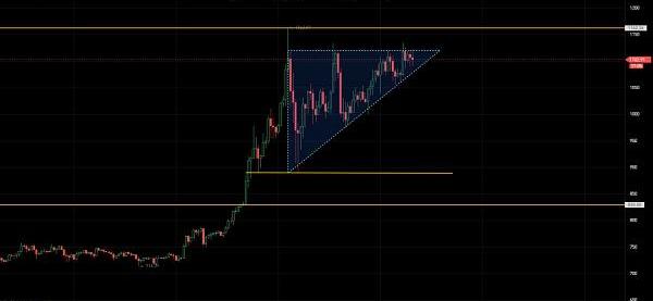 如圖所示,以太坊處于收斂結構末端,即將選擇方向,重點關注比特幣走勢,若比特幣能夠站穩34000附近或繼續上行,以太坊可能選擇跟隨上行;若比特幣下殺,則可能成倍于比特幣下跌幅度。以太坊上方1170前高位置構成短期壓力位,下方支撐關注1000整數位和890附近。
