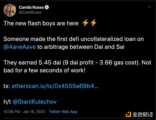 ArbitrageDAO于2020年1月18日完成第一筆無抵押的閃電貸。見下圖Camilla Russo的報道。
