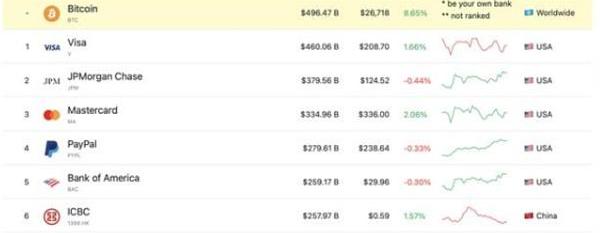 市值超越全球最大金融機構Visa。根據小威查詢數據顯示,比特幣以4990億美元市值超越了4600億美元市值的Visa,成為全球第一大金融“公司”。將比特幣稱為“金融公司”有些奇怪,它是該排行榜中唯一標注為“全球共有的”。