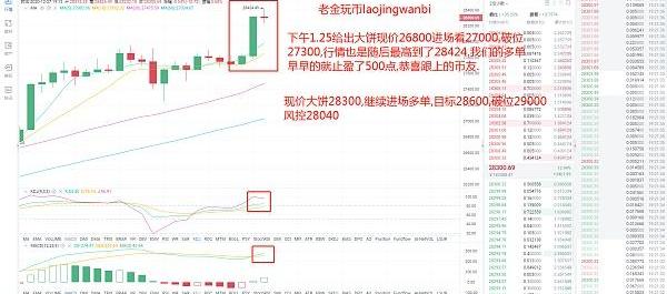 XRP/HKD-2.92%恭喜跟上老金玩幣實盤布局空單操作的幣友們,今日下午1.25左右給出大餅現價26800位置進場多單,目標27000,破位27300.行情在剛剛漲到了28424位置附近,多單策略完美止盈500點的利潤,策略每天全網公開。更多實時指導聯系
