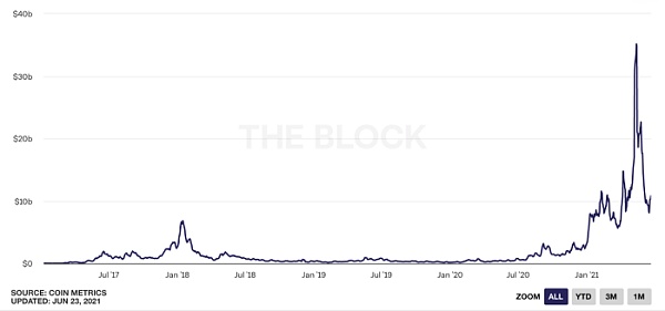 DeFi已成為了以太坊網絡中第一類被廣泛使用的應用。目前,DeFi擁有600億美元的AUM(在2021年5月初達到峰值1200多億美元),170多億美元的貸款規模,平均每天促成了50億美元的交易量。總體來看,這些DeFi應用產生了超過了45億美元的年收入(過去30天支付給協議的費用代表著收益),并且建立了可觀的流動性來創造網絡效應。