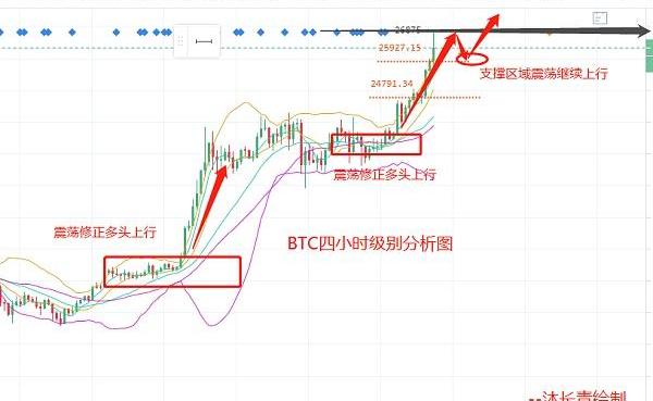 短周期4小時圖中K線在經歷一段時間震蕩修正,伴隨著少陰一路上漲,這也導致了目前底部結構不穩定,幣價如果繼續上行,可能需要時間等待各均線筑底,所以短期多頭不能強勢突破27000區域,行情將再次陷入震蕩中,對于這種時候我們只需低多為主即可,畢竟大周期偏向多頭
