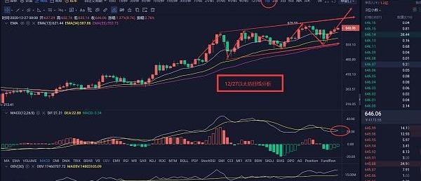 自從觸及低點550之后,日線連續3連陽,昨天晚上強勢上漲沖高破位輝神上次視頻中提到的638一線,高點上探至653一線。雖然今日早間6:15深度回踩至630一線,但早盤還是收回跌幅,再次沖高前高653附近,沖高未遂。目前比價在645附近運行。