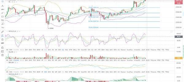 從四小時圖來看,昨日下午行情向上突破。向布林通道小幅張口向上,且幣價靠近上軌運行。MACD快慢線在零軸上方向下運行,能量柱呈空頭排列,與布林帶形成背離。KDJ三線合理區高位運行有受行情。一小時圖中,布林帶雙軌開口上移,各均線指標勾頭向上且呈多頭排列,今日上方壓制先關注24800,破位依次關注25000-25200。下方支撐先看攻擊線24510附近,破位依次關注24320-24130。今日多頭仍表現出強勁的上攻動能,綜合盤面繼續低多思路,高空為輔。