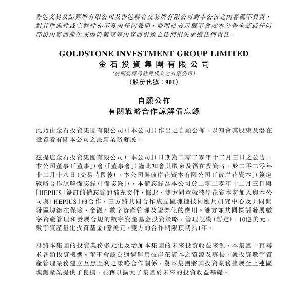 XRP/HKD-2.47%12月18日,港股主板上市公司金石投資(00901.HK)與BAFCAPITAL(彼岸花資本)正式簽訂了戰略合作諒解備忘錄,共同探討發展數字資產管理基金和發展合規的數字資產投資策略。BAFCAPITAL(彼岸花資本)將加入金石投資集團與HEPIUS共同合作成立的區塊鏈技術應用研究中心及共同開發區塊鏈在保險、金融、數字資產管理及證券化的應用。