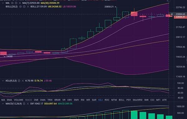 日線圖中,比特幣日內行情經過凌晨千余點回調后,價格上行力度開始減弱,目前多空雙方膠著23100位置附近,行情處于高位盤整,局勢暫時沒有明顯信號,筆者珊珊預計震蕩行情還會延續一段時間。