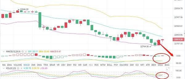 截止目前幣價最高是到了22700附近,行情走勢非常的強勢。小時圖來看,布林帶開口成向上張口姿態,目前行情受阻在22800附近調整,價格回落200多點,多頭有轉弱跡象,后續謹防價格反轉下跌,建議不要盲目追漲,回調多單更為穩健,短期支撐位是22750附近。