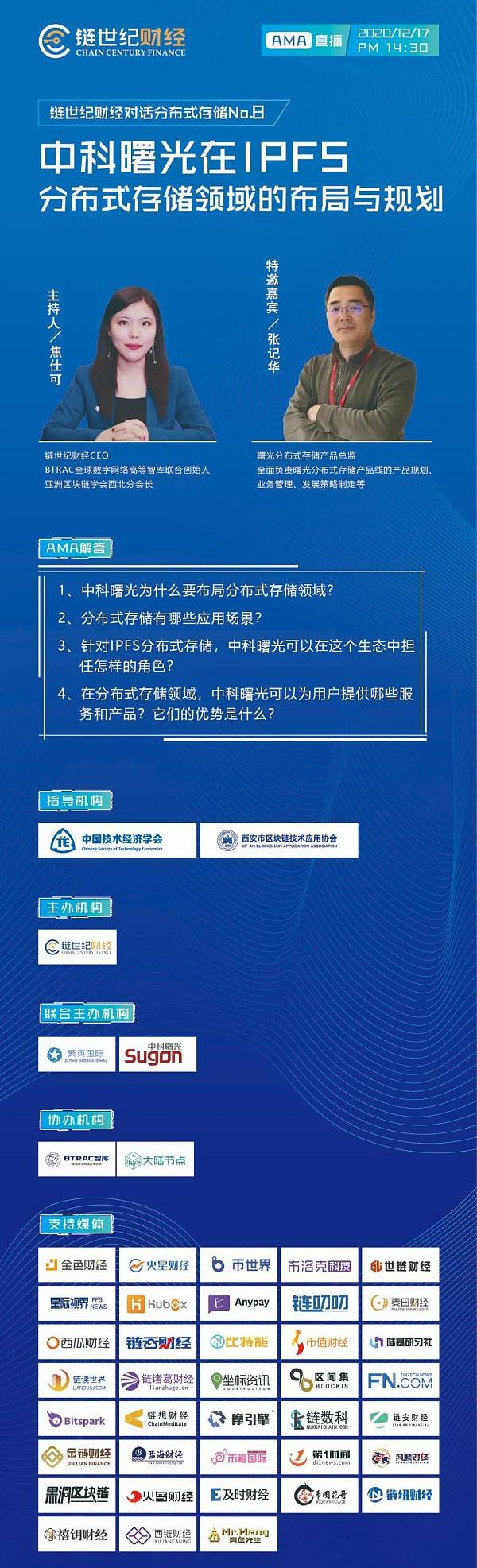 XRP/HKD-0.26%分布式存儲在數字時代越發重要,關于分布式存儲的技術、產品、應用場景,成為分布式存儲產業鏈參與者爭相學習與參與的對象。鏈世紀財經針對分布式存儲領域的發展,特推出《鏈世紀對話分布式存儲》專題欄目,與廣大從業者共同見證分布式存儲的快速發展。12月17日,由鏈世紀財經主辦,聚英國際、中科曙光聯合主辦,BTRAC全球數字網絡高等智庫、大陸節點協辦的鏈世紀財經對話分布式存儲No.8-中科曙光在IPFS分布式存儲領域的布局與規劃AMA如期舉辦,讓我們一起看看有哪些干貨吧!