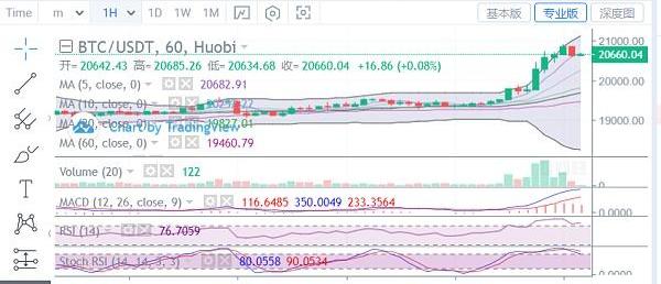 昨日比特幣價格一根大陽柱收尾,行情強勢上行刷新歷史高點,且后續力度較強,價格順勢突破20000關口,再度走出一波800多點的漲幅。目前行情是延續昨日漲幅,價格在緩慢向上試探,高點臨近21000位置附近,日線圖上看,布林帶上軌缺口被打開,各均線也是紛紛呈上行姿態,整體還是保持多單占優局面,且上方空間被打開,日內行情頭進一步上行的可能。