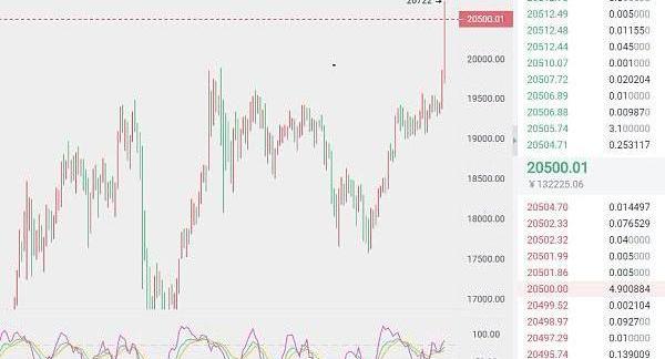 今晚比特幣晚間多頭再次開啟,價格不斷刷新歷史高點,20000關口瞬間突破,且短時間內再度上漲700多點,截止到目前高點觸及20722位置才出現回調,日內比特幣漲幅一千多點,上方空間再次被打開。副圖指標已經跟不上節奏了,下方關注支撐20000這一重要位置
