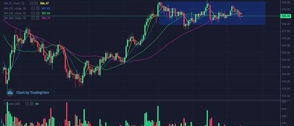 ETH短期處于高位震蕩的走勢,日內暫時關注區間兩個點位如圖,上方阻力595,下方支撐580。