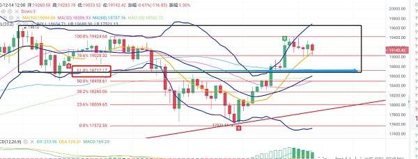 四小時價格已經收回上次的跌幅,價格依舊沒有沖破19500的位置,多次在布林帶上軌18420附近開始回落,現在布林帶開口向上,使得價格的上方空間變大,目前價格維持在10日均線上方高位運行,關注60日均線位置18700支撐,以及18500支撐。