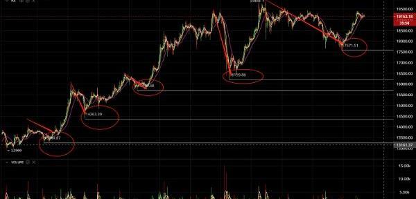 XRP/HKD-1.21%大家好,我是紫獅財經CEO,Hyrik老師。上周六日,按照之前市場節奏本應該是走回調蓄勢的行情走勢。結果卻是走了一個深V反彈,拒絕掉了周六日機構休息比特幣大概率回調的短期規律,并且在反彈上攻到19000刀大關以上去站穩了。而研究行情走勢咱們也不難發現,比特幣今年從312暴跌之后,大多數的回調都是以深V反彈結束掉的。具體幣友們看下圖: