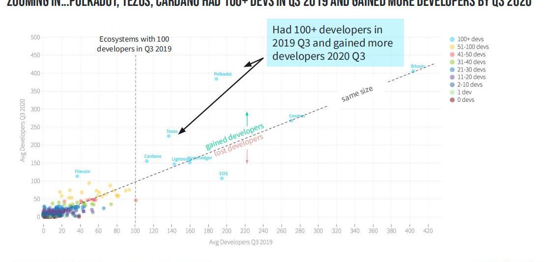 2.Polkadot、Tezos、Cardano在2019年第三季度擁有超過100個開發者,并在2020年第三季度吸引了更多開發者。