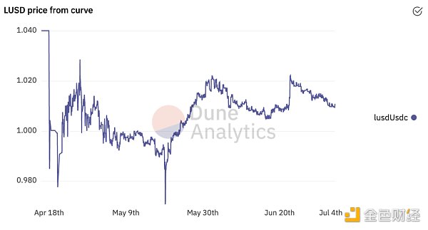 可以看出,雖然Liquity上線尚不足3個月,且ETH在這期間內價格下跌最多超過50%并有單日下跌超過40%的情形,但是LUSD的價格波動一直保持在0.97~1.03,并且絕大部分時間在0.99~1.02之間,這顯示了LUSD的穩定性。