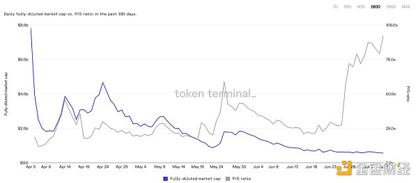 Liquity的協議收入全部由LQTY代幣捕獲,所以其P/S(全流通市值/年化協議收入)?和?P/E(全流通市值/年化協議利潤)?其實是一致的。自上線以來,LQTY的代幣全流通市值與P/S的走勢如圖: