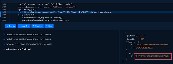 接下來,攻擊者通過攻擊合約在一筆交易反復調用MasterChef合約中的抵押提取函數將MasterChef中PID為16的抵押池中的xYELD代幣數量減少0到最小值。